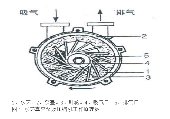 2BV型水環(huán)式真空泵如圖(1)所示葉輪3偏心地安裝在泵體之內(nèi),起動(dòng)時(shí)向泵內(nèi)注入一定高度的水,因此當(dāng)葉輪3旋轉(zhuǎn)時(shí),水受離心力的作用而在泵體內(nèi)壁形成一旋轉(zhuǎn)水環(huán)1,水環(huán)下部?jī)?nèi)表面與輪轂相切,沿箭頭方向旋轉(zhuǎn),在前半轉(zhuǎn)過(guò)程中,2BV型水環(huán)式真空泵水環(huán)內(nèi)表面逐漸與輪轂脫離,因此在葉輪葉片間與水環(huán)形成封閉空間,隨著葉輪的旋轉(zhuǎn),該空間逐漸擴(kuò)大,空間氣體壓力降低,氣體自圓盤吸氣口被吸入;在后半轉(zhuǎn)過(guò)程中,水環(huán)內(nèi)表面逐漸與輪轂靠近,葉片間的空間逐漸縮小,空間氣體壓力升高,高于排氣口壓力時(shí),葉片間的氣體自圓盤排氣口被排出。如此葉輪每轉(zhuǎn)動(dòng)一周,葉片間的空間吸排氣一次,許多空間不停地工作,2BV型水環(huán)式真空泵就連續(xù)不斷地抽吸或壓送氣體。