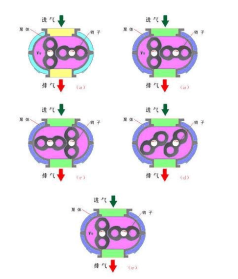 如圖為羅茨泵轉(zhuǎn)子由0°轉(zhuǎn)到180°的抽氣過程。在0°位置時(圖中a),下轉(zhuǎn)子從泵入口封入v0體積的氣體。當轉(zhuǎn)到45°位置時(圖中b),該腔與排氣口相通。由于排氣側(cè)壓強較高,引起一部分氣體返沖過來。當轉(zhuǎn)到90°位置時(圖中c),下轉(zhuǎn)子封入的氣體,連同返沖的氣體一起排向泵外。這時,上轉(zhuǎn)子也從泵入口封入v0體積的氣體。當轉(zhuǎn)子繼續(xù)轉(zhuǎn)到135°時(圖中d),上轉(zhuǎn)子封入的氣體與排氣口相通,重復上述過程。180°(圖e)位置和0°位置是一樣的。轉(zhuǎn)子主軸旋轉(zhuǎn)一周共排出四個v0體積的氣體。