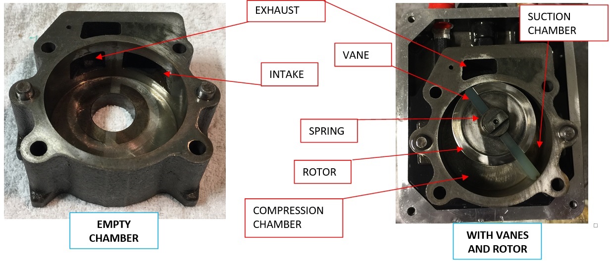 氣體進(jìn)入吸氣腔,并立即被轉(zhuǎn)子的葉片壓縮。當(dāng)轉(zhuǎn)子旋轉(zhuǎn)時(shí),它將氣體分子推向泵室,并朝向排氣,然后被排放到大氣中。