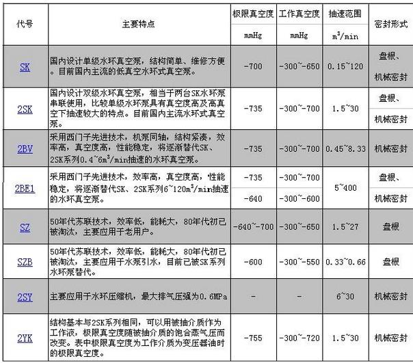 初步選定了泵的類型之后,對于真空泵,還要根據(jù)系統(tǒng)所需的氣量來選用泵的型號。 關(guān)于真空泵的抽速選擇及抽氣時(shí)間計(jì)算可參照我公司網(wǎng)頁面對各種型式的水環(huán)式真空泵及壓縮機(jī),我們特將其各自特點(diǎn)收集如下,以利于用戶選型 代號 主要特點(diǎn) 極限真空度 mmHg 工作真空度 mmHg 抽速范圍 m3/min 密封形式